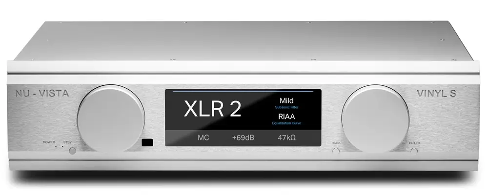 The Nu-Vista Vinyl S supports systems with multiple turntables or tonearms thanks to its two RCA inputs, two balanced XLR inputs, one RCA output, and one balanced XLR output. Each input can be independently configured with gain, loading, and cartridge type, with settings stored per input for instant recall. The three-stage subsonic filter—off, mild, or standard—effectively reduces low-frequency rumble from warped records or turntable vibration without compromising musical integrity. This level of flexibility ensures the Vinyl S integrates effortlessly into both simple and highly complex analog setups.