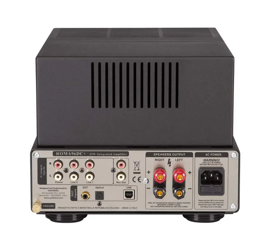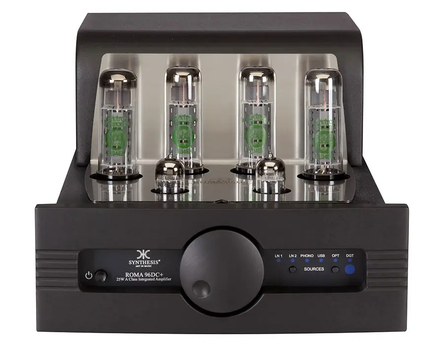 The Synthesis Roma 96DC+ is a 25W Class A stereo integrated amplifier, utilising four high-quality EL34 and two ECC82 valves in the design. Featuring a variety of digital and analogue inputs, including a moving magnet phono stage; it is both a high-end performer and a wholly convenient solution for music lovers.