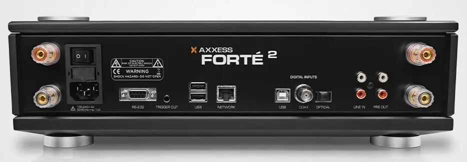 Effortless versatility – Axxess Forté 2 is your complete audio hub: streamer (Ethernet, USB, optical, BNC), DAC, preamp, speaker amp, and dedicated headphone amp in one.