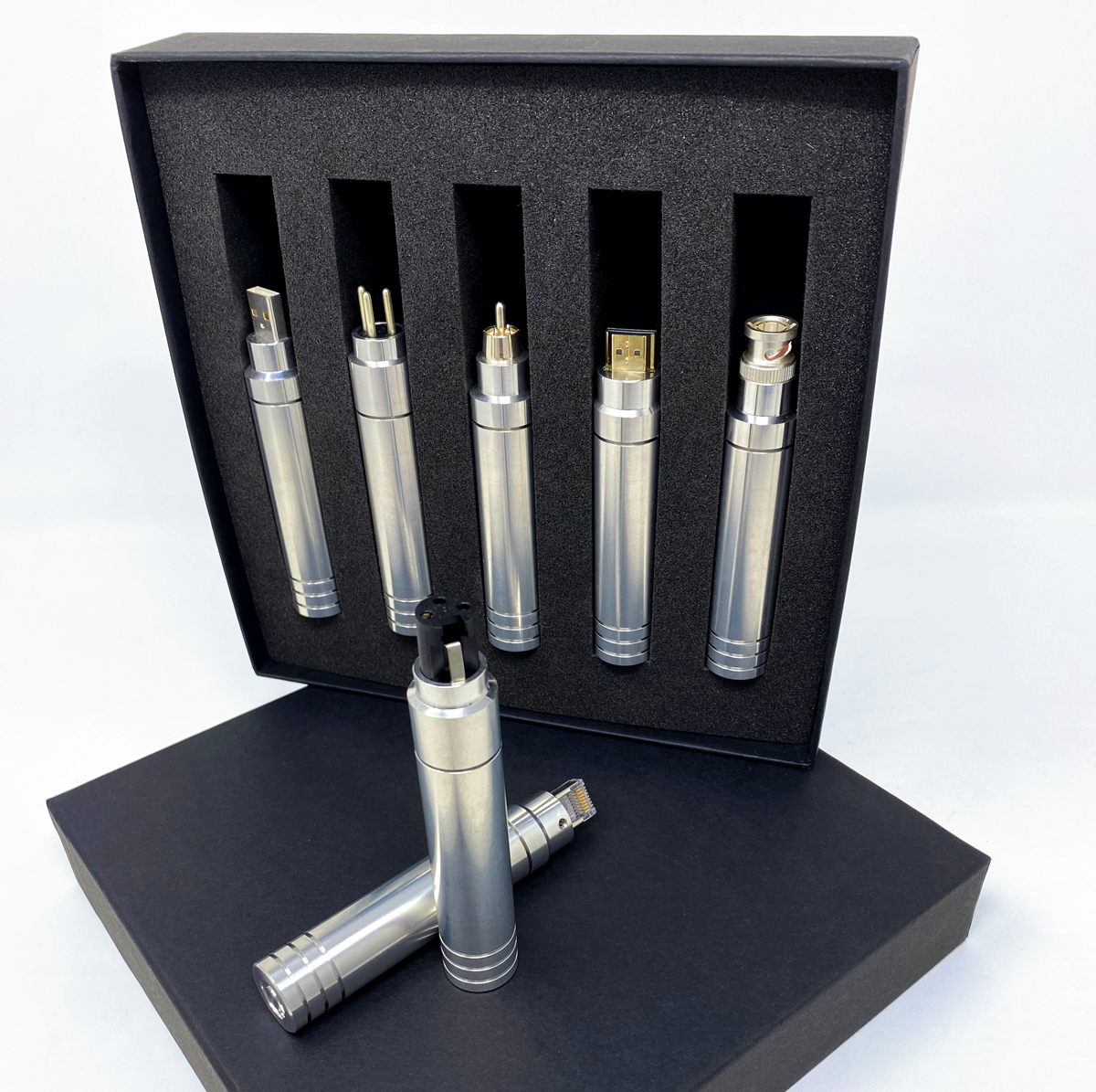 The GroundARAY is a cylindrical design made from precision CNC-machined thick-walled aluminium; the thick walls are designed to themselves stop the device from contributing HF noise. Available in six termination options, including USB A, RCA and XLR, for a wide range of digital and analogue A/V devices, Chord tells us that the GroundARAY benefits from five separate noise-reduction systems, all working across different HF noise ranges and operating in parallel to convert undesirable HF electrical noise into heat.