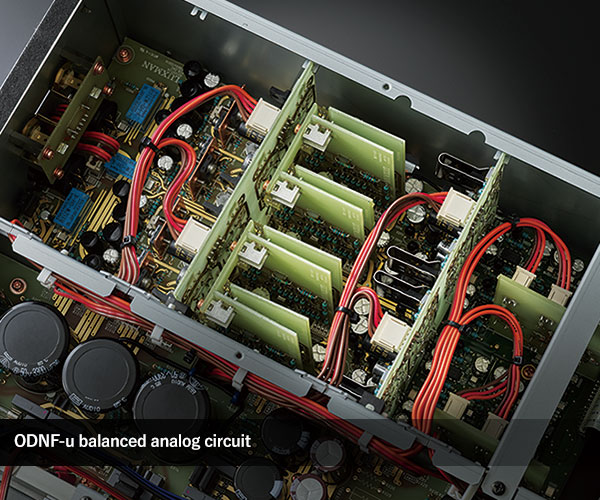 Negative feedback is an extremely powerful tool in analogue circuit design. But minuscule inaccuracies in the application of feedback can compromise the expressive power of music reproduction. For this reason, Luxman has developed and refined the Only Distortion Negative Feedback (ODNF) circuit, culminating in ODNF-u, which debuts on the D-10X. This fully balanced configuration maximizes error detection accuracy, for greater musical expression across the audio band. Tailored, gradual 1st order filter x 3 band processing achieves a natural waveform without the need for conventional output filters.