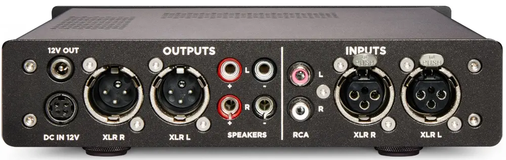 The amplifier features both balanced XLR and unbalanced RCA inputs, as well as balanced XLR outputs for bypass or throughput to other devices. This flexibility allows integration into various audio systems and configurations.