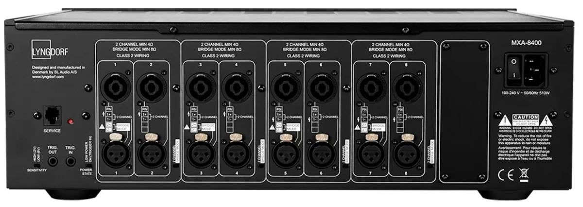 The Lyngdorf MXA-8400 Multi Channel Amplifier is a meticulously crafted 8-channel power amplifier designed to deliver exceptional audio performance. Manufactured at the Lyngdorf Audio facility in Denmark, each unit undergoes stringent quality control measures, including a rigorous 24-hour test with all channels driven. This exhaustive testing process is crucial to guarantee the amplifier's reliability and adherence to specified performance parameters.