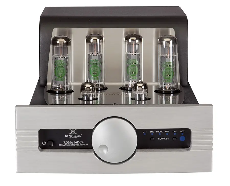 The Synthesis Roma 96DC+ is a 25W Class A stereo integrated amplifier, utilising four high-quality EL34 and two ECC82 valves in the design. Featuring a variety of digital and analogue inputs, including a moving magnet phono stage; it is both a high-end performer and a wholly convenient solution for music lovers.